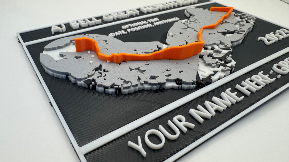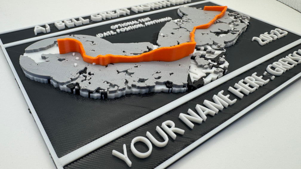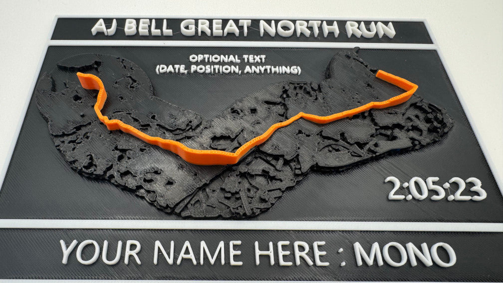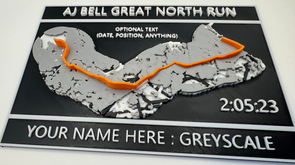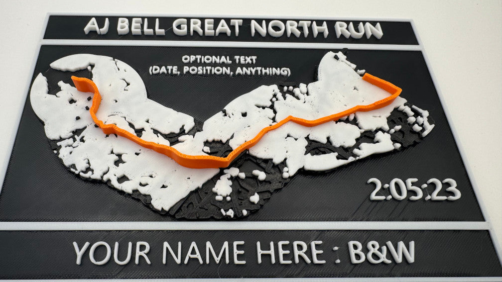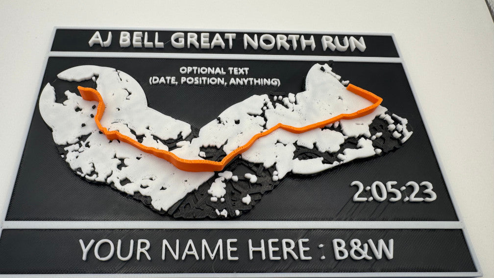 Turn your run into a lasting memory with this custom 3D printed map of the AJ Bell Great North Run route. Each piece is crafted with precision from your GPX data, showing your exact race path as a raised line across the cityscape. Add your name, finishing time, and optional text (such as date, position, or club standard) to make it uniquely yours.