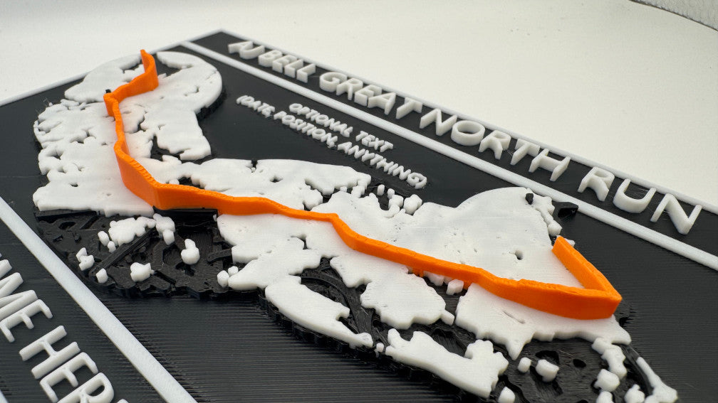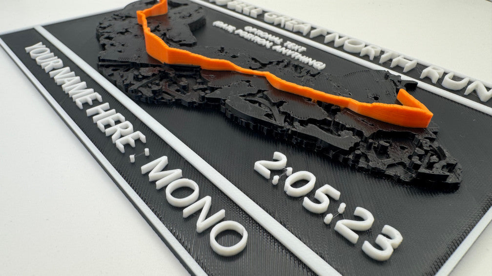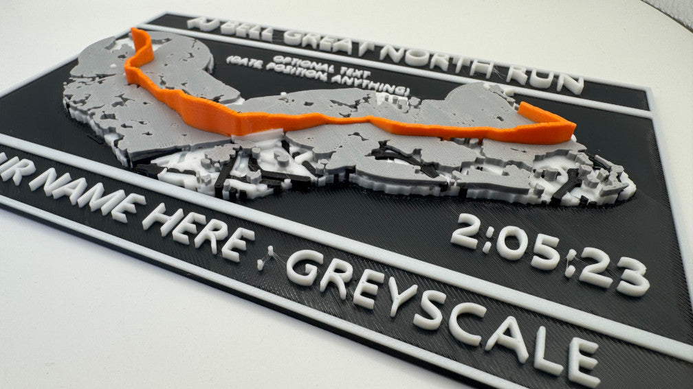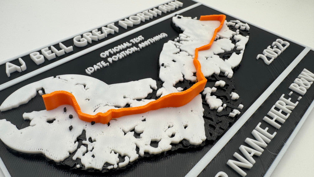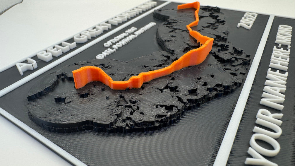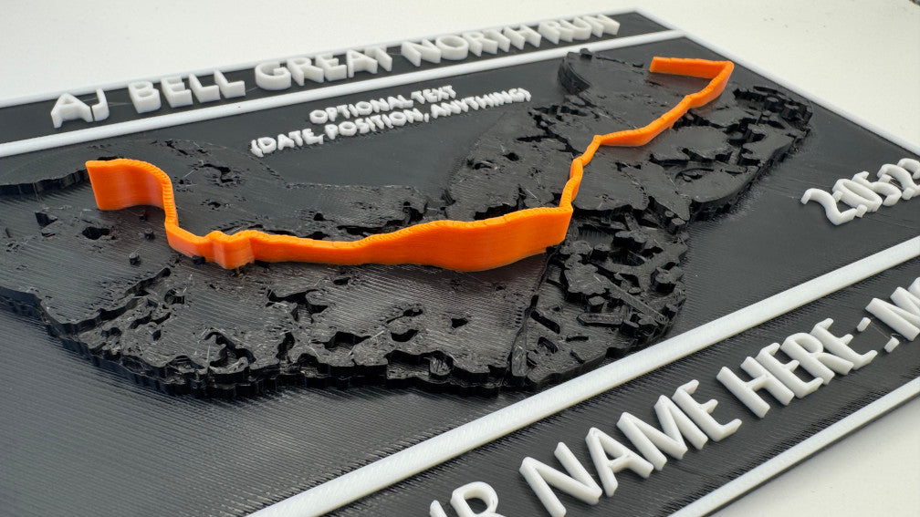 Turn your run into a lasting memory with this custom 3D printed map of the AJ Bell Great North Run route. Each piece is crafted with precision from your GPX data, showing your exact race path as a raised line across the cityscape. Add your name, finishing time, and optional text (such as date, position, or club standard) to make it uniquely yours.