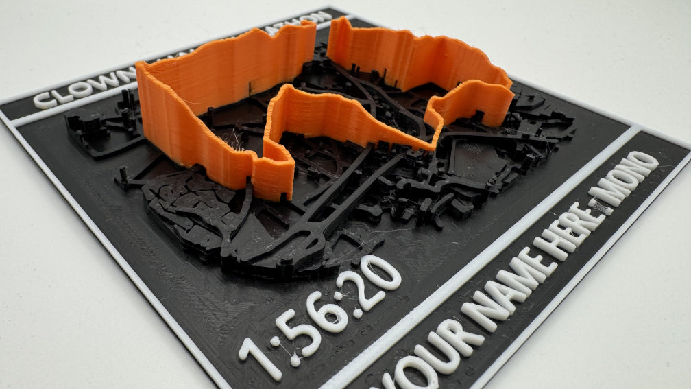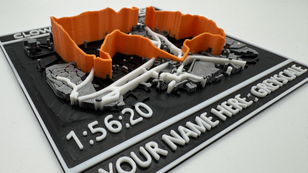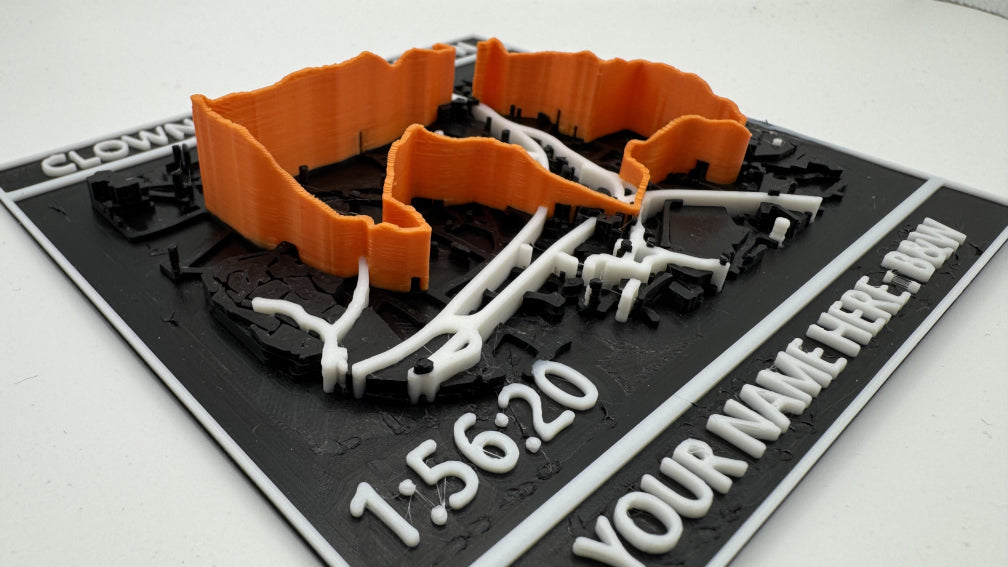 Each map is 3D printed in high quality, layered filament to give depth and texture to your achievement. The course itself is highlighted, making it stand out proudly against the background terrain.
