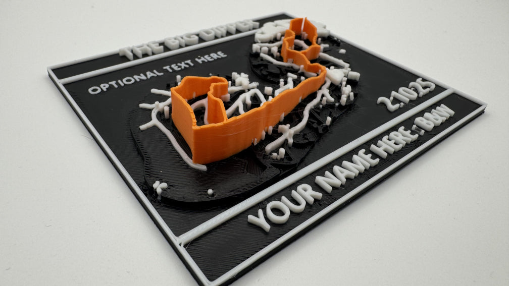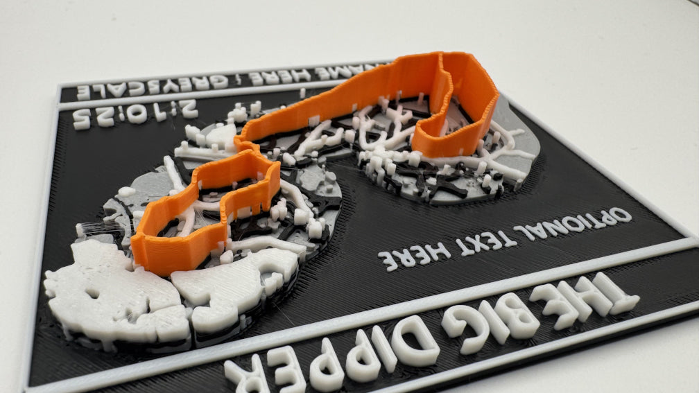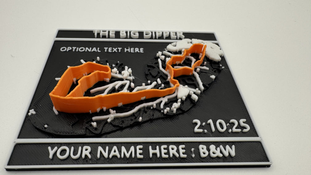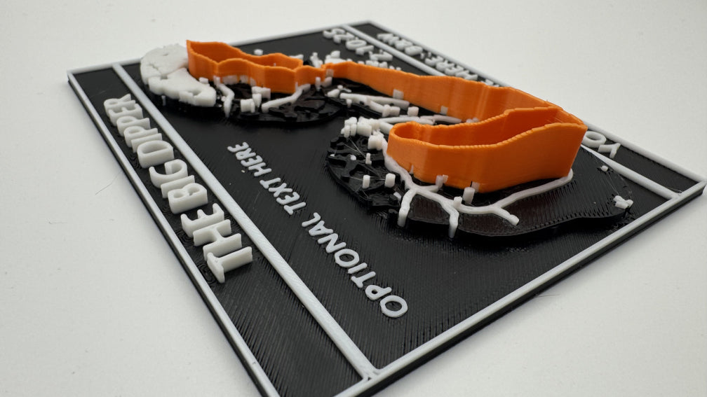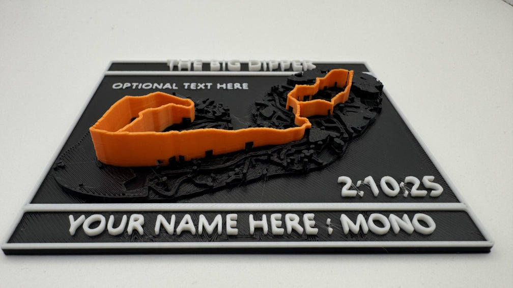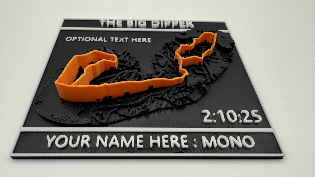 Capture your run of The Big Dipper in a unique 3D printed map you can treasure forever. This bespoke race memento brings your route to life in raised detail, featuring the official course, personalised with your name, finish time, and optional text.