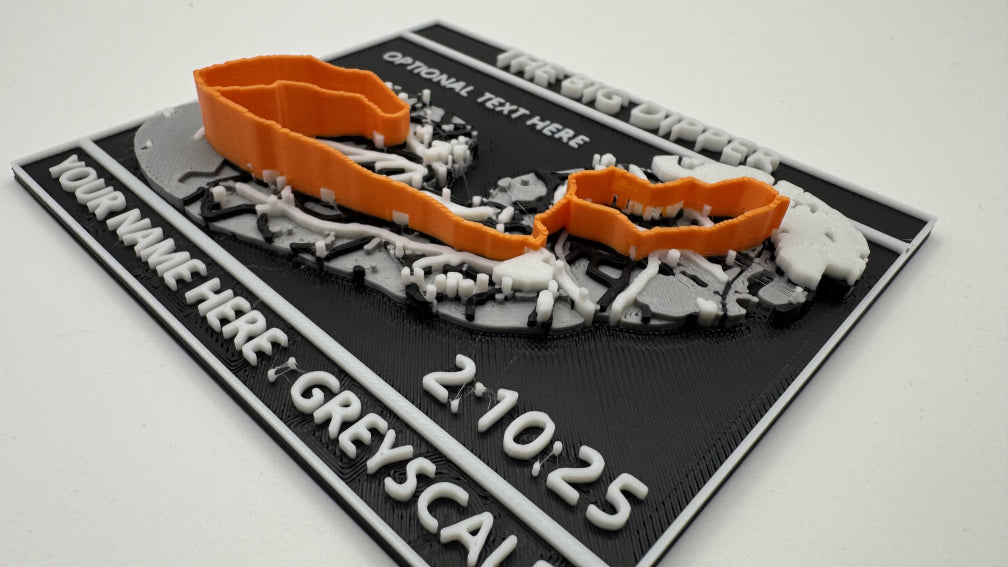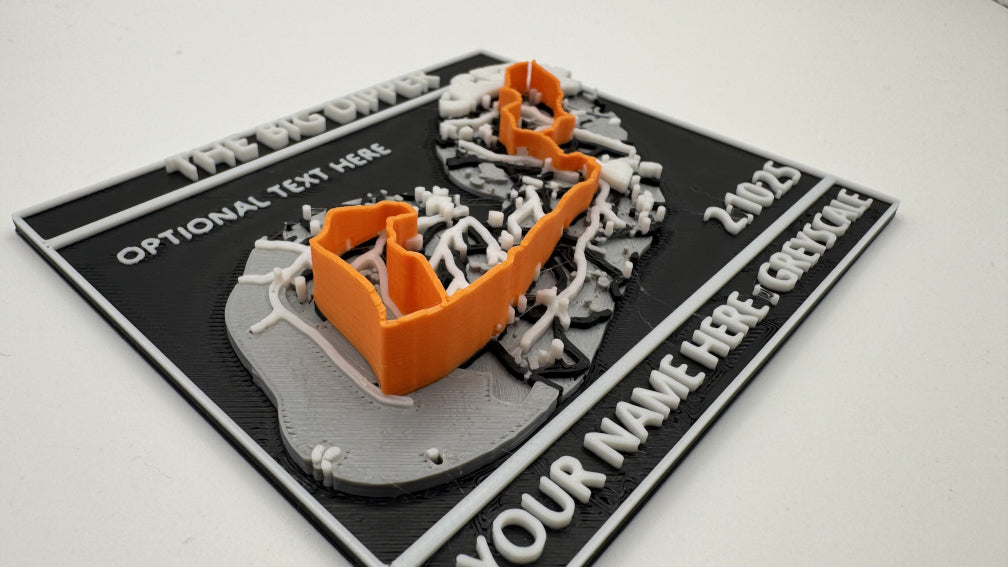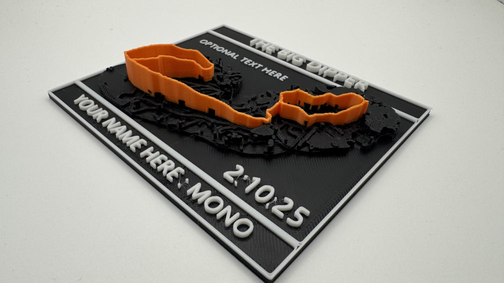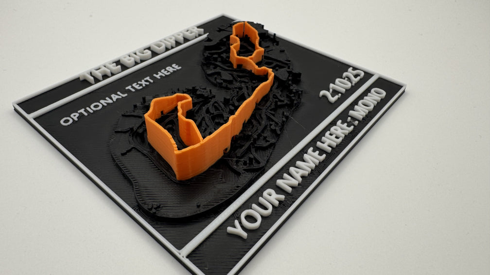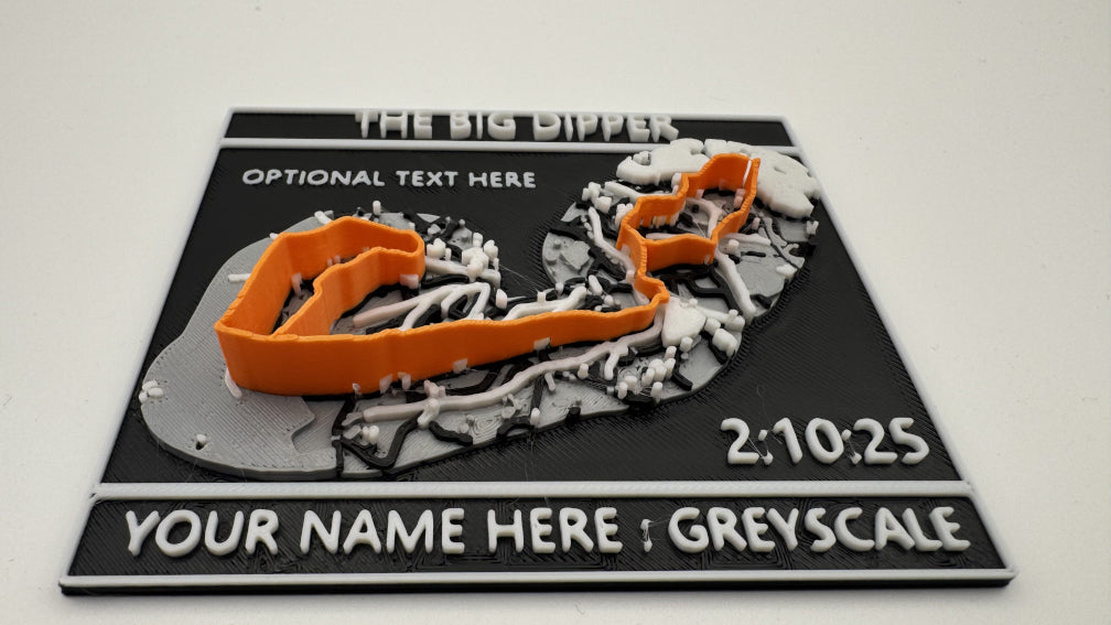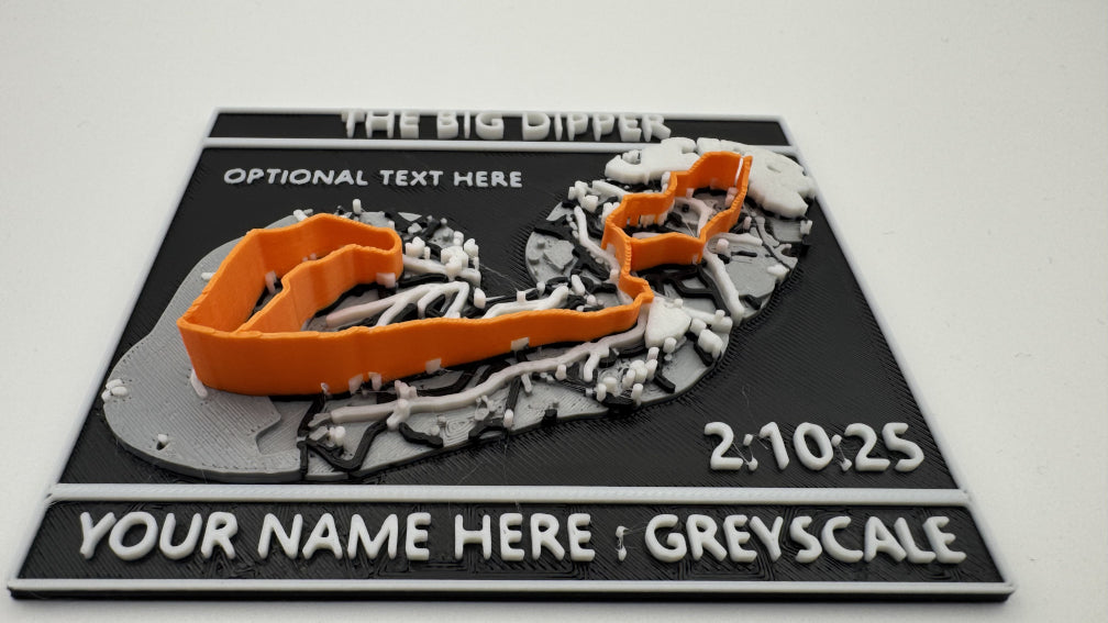 Capture your run of The Big Dipper in a unique 3D printed map you can treasure forever. This bespoke race memento brings your route to life in raised detail, featuring the official course, personalised with your name, finish time, and optional text.