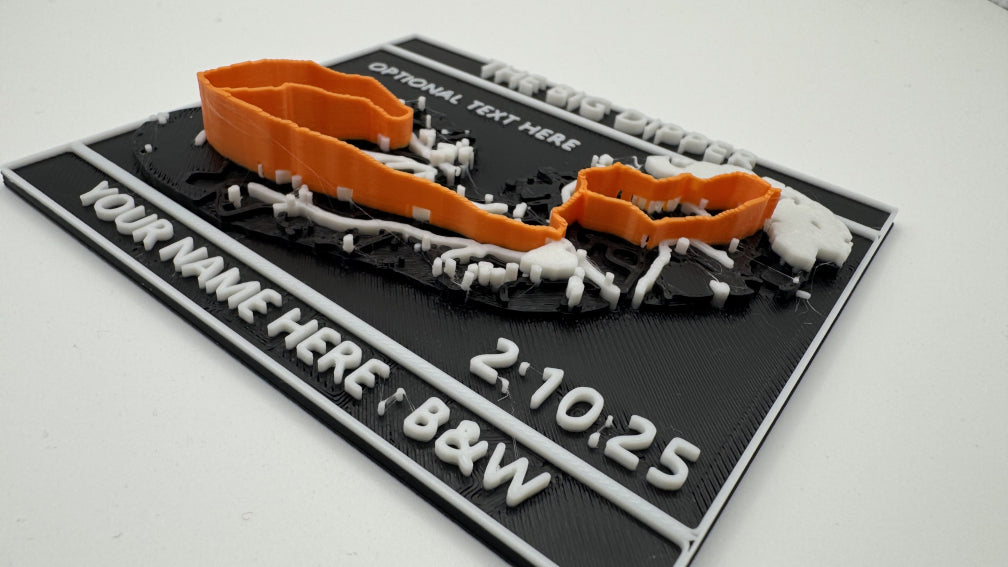 Each map is 3D printed in high quality, layered filament to give depth and texture to your achievement. The course itself is highlighted, making it stand out proudly against the background terrain.